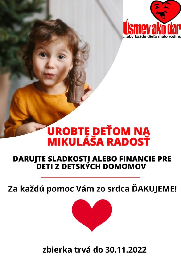 Od 14. 11. 2022 do 30.11.2022 máš možnosť zapojiť sa do Mikulášskej zbierky. Cieľom je podeliť sa so sladkosťou (cukríky, keks, čokoládu, lízanku…) a darovať