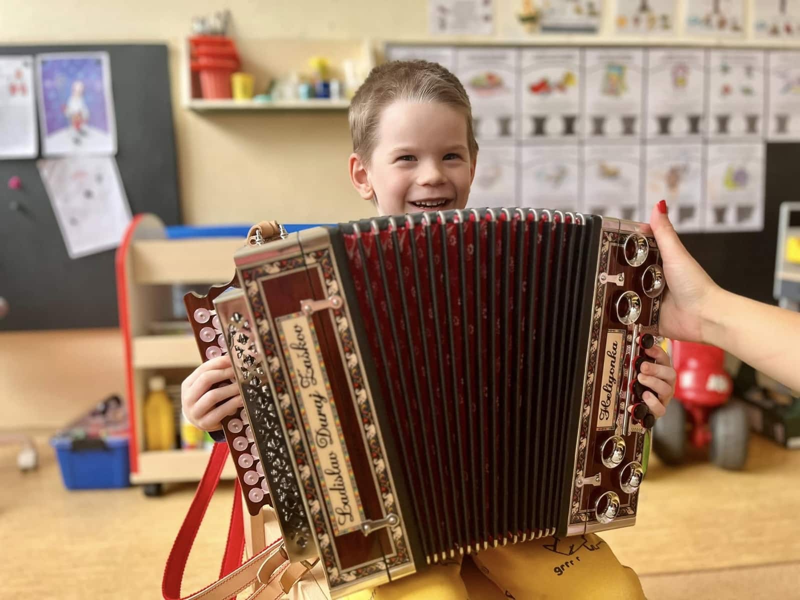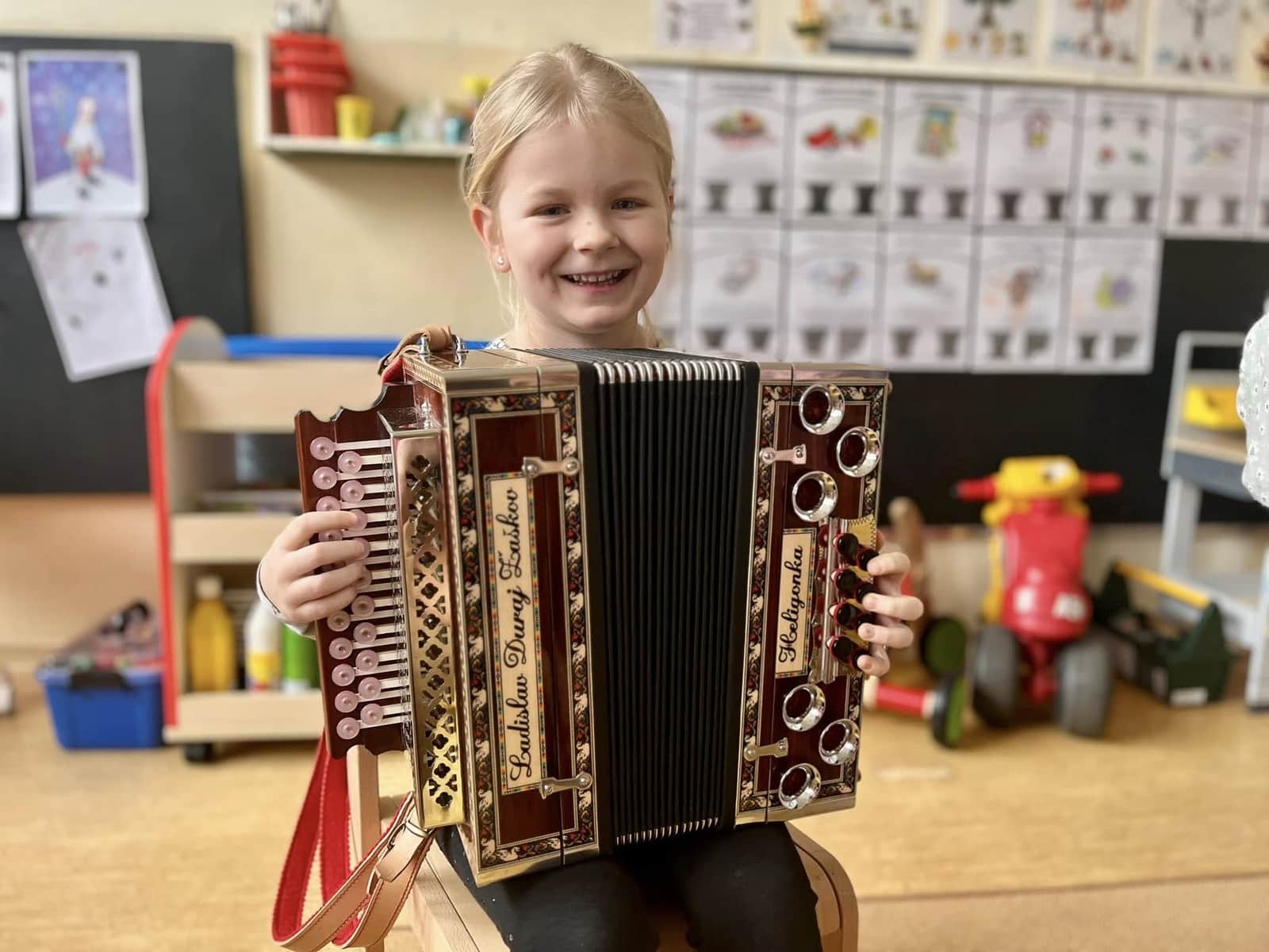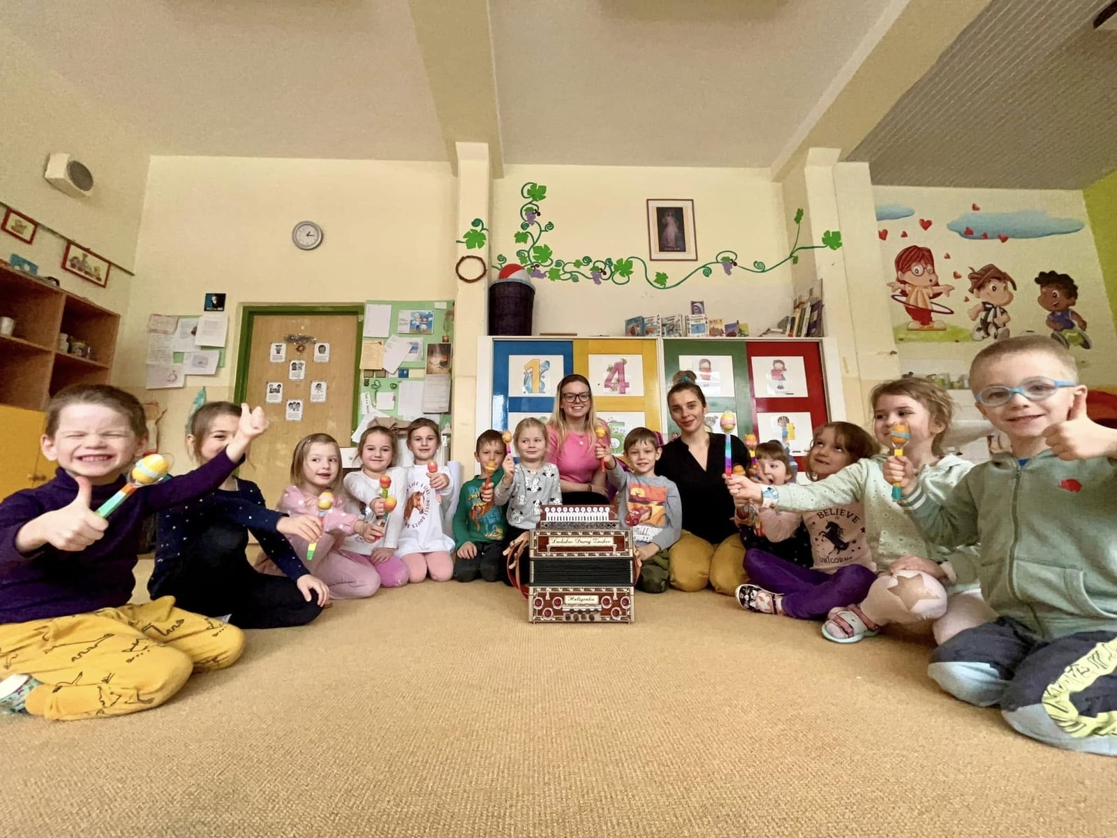 Škôlkári v rámci folklórneho krúžku Palček 🎶 zažívajú veľa zaujímavého. Spievajú piesne, zoznamujú sa s jednoduchými tanečnými krokmi💃🏼🕺🏼, využívajú rytmické nástroje. Aktuálne spoznávali tradície Fašiangov, s čím bol spojený aj spev 🎤 piesne Fašiangy, Turíce sprevádzaný hrou na heligónke pani učiteľkou a hrou na rumbaguliach 🪇, ktoré si deti vlastnoručne vyrobili. Najväčšiu radosť🤩, však mali z toho, že si vyskúšali hrať na heligónke. Deti z folklórneho krúžku Palček s pani učiteľkou Martinkou a Erikou ☺️