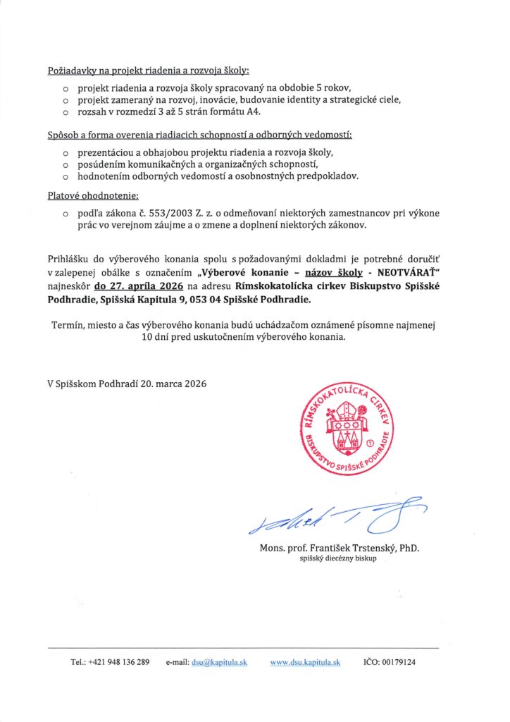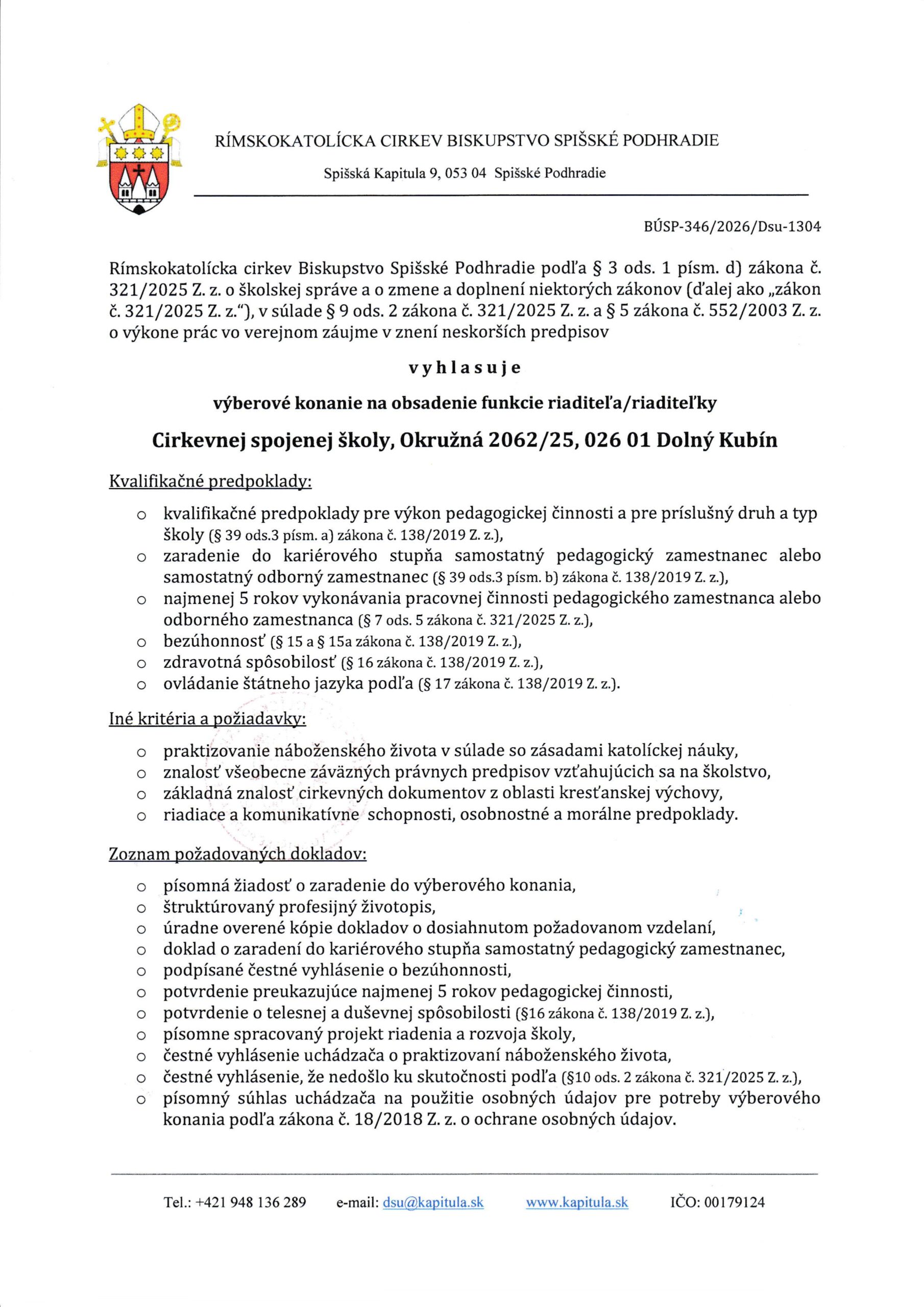 Výberové konanie na obsadenie funkcie riaditeľa Cirkevnej spojenej školy Dolný Kubín
